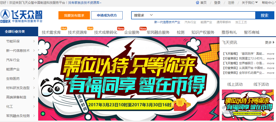 一、平台简介飞天众智中国制造科技服务平台依托于中国航天系统科学与工程研究院及上海张江高科技园区开发股份有限公司成立的,专注于“中国制造2025”、服务于长三角制造业中小微企业的科技和研发链管理服务平台。平台坐落于上海张江核心园,服务场地面积1600平方米,另有300平方米众创空间正在装修过程中。平台运营以“激活就是价值、知识就是优势、人才就是动力、创新就是未来”为发展理念,以“产业报国、需求牵引、技术推动、协同创新”为发展价值观,以“成为最受尊重的全球制造业技术共享平台”为愿景,以“让研发成本更低、效率更高”为使命,服务《中国制造2025》、“十三五”规划以及“一带一路”,实施“互联网+”行动计划。平台拥有一支专业且优质的管理团队,自2015年10月成立至今发展迅猛服务高效,共成立近百家科技服务协同点,员工200余人,服务范围辐射泛长江三角洲地区。平台将继续扩张各地协同点,预期至2018年总投入6000余万元,包含线下协同点的扩张、线上功能模块的扩展以及各类合作资源的开发。平台通过良好的运营管理方式和商业发展模式,不断增加服务要素在投入和产出中的比重,以免费服务带动盈利性服务,极大的降低了小微企业获得优质科技服务和研发链管理服务的成本。平台与上海市浦东新区政府经信委达成合作意向,共建上海(浦东)产业合作交流平台——凤凰联盟,加强上海(浦东)与长江流域等地区多方产业合作,促进区域经济优势互补、协同发展。平台的功能模块突出表现为科技和研发链的管理服务,可立足于浦东新区,辐射长三角,面向“中国制造2025”产业范围内的中小微企业提供:科技研究开发总包分包、产品科技提升咨询、高端工业设计、研发数据及情报咨询、研发过程检验检测、研发及检测设备共享、知识产权与成果转移转化、军民融合技术、航天空间搭载等研发全过程、全流程的综合性科技服务。平台建设理念符合国家最新导向“互联网+”制造业的方向,运用互联网手段建设网络平台,聚集科技研发全过程的研发与检测设备、研发与设计专家、研发与情报数据、知识产权与成果交易等研发链各节点资源,同时为企业提供军转民、民参军渠道,促进军民融合发展,加快推动中小微企业提质增效升级。未来平台将根据市场需求,不断完善自身功能和服务为制造业企业提供更优质的技术、研发能力提升和项目管理服务。二、平台的服务事项:平台依托功能模块建设及“互联网+”模式发展理念,为“中国制造2025”行业范围内的中小微企业提供了制造业研发全流程服务:(一)、 科技研发与成果转化服务:航天军工体系的科技研发具有品类全、研发能力强等特点,往往中小微企业由于体量、人才、设备的限制,科技研发能力相对较弱。平台利用航天军工体系的研发能力提升企业的科技研发能力,满足其对研发的需求,同时转化成熟科研成果,也是促进军民融合的重要手段。在这过程中,平台提供科技成果转化、科技研发任务总包分包、科技创新能力提升等咨询管理服务。(二)、 制造业检验检测服务:平台的战略合作单位中国航天科技集团公司第八研究院第808研究所建设了中国航天科技集团公司航天元器件检测验证中心,具备各类产品的监制、验收、筛选、失效分析、辐照可靠性、检测验证技术研究条件。同时,平台还整合分散的航天军工系统航天八院、航天一院、航天五院的科技能力、检测能力、服务能力,形成了系统整合、行业划分、市场运行的军工检测能力、设备与民用检测需求任务的总包分包服务体系。同时为企业研发过程提供全程检测与跟踪服务。(三)、制造业企业开放式创新与研发能力提升服务:平台积极建立创业创新模式,为企业的新产品新技术开发论证与市场调研、法律服务、技术情报数据咨询、军民融合渠道推广等服务的O2O开放式科技和研发管理服务。同时依托平台所聚集的航天科技能力、高校及科研院所的科技能力为企业的科技内涵提升、产品升级换代、生产能力科技改造等需求提供解决方案。(四)、产品/产业工业设计服务:平台致力于产品/产业工业设计、技术与信息三大核心能力的融合运用,延伸工业设计的服务领域和服务模式,推动企业产品和服务的创新升级。平台运用整合研发科技成果为产品/产业工业设计开拓新的道路,做到技术美、形式美、艺术美与装饰美。(五)、 空间搭载服务 平台与中国空间技术研究院合作,为社会各界提供空间搭载支持服务,可利用包括返回式卫星和神州系列宇宙飞船在内的搭载条件,提供生物菌种、农林植物种子、高性能材料和其他商业产品等项目进行空间科学试验生产、开发具有高附加值的产品的途径。(六)、 知识产权交易、保护与评估服务:平台为广大中小微企业提供专利科技交易、保护、评估及鉴定服务,并为知识产权申报、培训机构等提供综合服务。同时积极建立知识产权数据库,促进知识产权交易专利池、专利联盟的诞生。