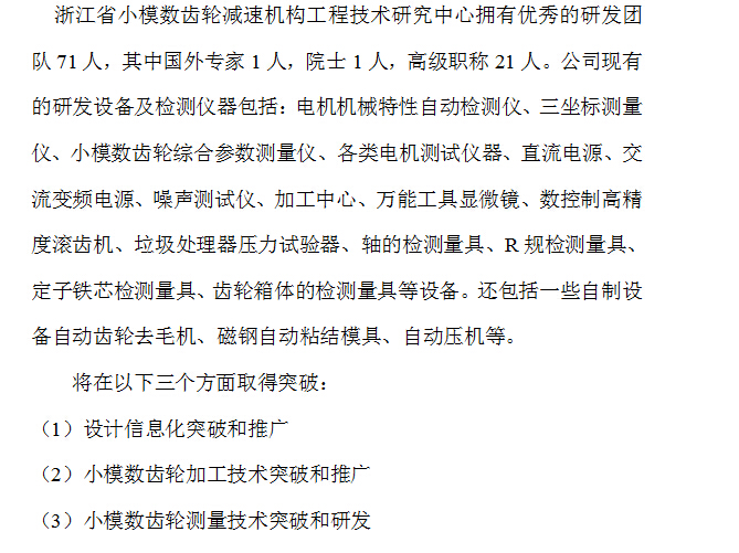 浙江省小模数齿轮减速机构工程技术研究中心拥有优秀的研发团队71人,其中国外专家1人,院士1人,高级职称21人。公司现有的研发设备及检测仪器包括:电机机械特性自动检测仪、三坐标测量仪、小模数齿轮综合参数测量仪、各类电机测试仪器、直流电源、交流变频电源、噪声测试仪、加工中心、万能工具显微镜、数控制高精度滚齿机、垃圾处理器压力试验器、轴的检测量具、R规检测量具、定子铁芯检测量具、齿轮箱体的检测量具等设备。还包括一些自制设备自动齿轮去毛机、磁钢自动粘结模具、自动压机等。 将在以下三个方面取得突破:(1)设计信息化突破和推广 设计信息化是齿轮与变速箱创新设计的基础,因为企业创新,第一靠数据积累,第二靠信息化的工具。数据积累是基础,原理创新,集成创新,到引进消化再创新,都离不开系统的数据积累。 a设计基础数据积累; b新产品实验数据积累; c生产工艺实践数据积累; d产品应用的数据积累。(2)小模数齿轮加工技术突破和推广 小模数齿轮传递力矩小,在设计齿轮时,一般不进行强度计算和刚度计算。齿轮模数的确定,通常由传动机构的结构尺寸选定。小模数齿轮的加工工艺过程中的切削力、夹紧力、支承力以及其他因素,有时会引起齿轮的变形和断裂。因此,合理制定小模数齿轮的加工工艺,防止加工过程中齿轮变形和断裂,是保证小模数齿轮质量的极为重要的因素。 小模数齿轮啮合种类较多,除常用的渐开线齿轮啮合外,还有各种修正摆线齿轮啮合和简化啮合,为保证齿轮精度,必须正确的加工出各种啮合的齿轮齿形曲线,因此对加工小模数齿轮的设备与工具的精度,有特殊的要求。 小模数齿轮传动中,为了缩小体积,得到较大的多级传动比,因此,要求小齿轮的齿数少。少齿数的齿轮加工,是小模数齿轮加工的特点。 小模数齿轮加工过程中,机床切向误差影响较小,由于小模数齿轮的径向精度、齿侧隙精度要求高,因此,当外界的因素:如振动、冲击力、温度变化等会直接影响齿轮加工精度。小模数齿轮加工的工作间,必须有较好的工作环境。关键技术:①小模数齿轮加工方法;②刀具选择;③加工精度控制。技术指标:使用高精度滚刀和改造的高精度滚齿机,将滚刀和工件的安装精度控制在1μm以内。(3)小模数齿轮测量技术突破和研发 小模数齿轮在精密量具、航空仪表、计时钟表中应用广泛。科学技术、制造工业的快速发展对微小型齿轮的制造精度和传动质量提出了越来越高的要求。实现对微小齿轮、尤其是批量生产的微小齿轮的精度和质量高效精确地测量和评定、在生产现场实施对齿轮加工过程的有效监控和诊断,以提高微小齿轮制造质量,是量具仪表制造行业亟待解决的一个关键技术问题。目前,用于生产车间或计量室中检测工件几何尺寸、形状精度的百分表、千分表等通用精密量具量大面广,质量要求也越来越高。我国机械百分表、千分表及卡尺表的年产量超过120万只,是个量表生产大国,但部分量表质量、精度不稳定,国内一些重要使用场合往往还得依赖进口量表,而大量出口量表产品只能低价或贴牌销售。众所周知,精密测量传动用微小齿轮( 如百分表及杠杆百分表的传动齿轮/齿条模数为0.15915 m m,千分表及杠杆千分表的传动齿轮/齿条模数为0.11mm,公制卡尺表的传动齿轮/齿条模数为 0.19894mm等) 是决定量具精度( 包括指示精度、灵敏度、重复性等) 的关键零部件,而在批量制造和装配过程中,对这些精密微小齿轮/齿条的精度和质量缺乏可靠有效的检测、监控和诊断,导致国产量表产品质量提升的问题难以得到解决,已成为行业发展的一个瓶颈。因此,开发出适用于工厂车间用的微小齿轮检测技术和仪器一直是我国精密量具制造行业的迫切需求。关键技术:①开发一种新的、 适合小模数齿轮的精密微型测角传感器;②开发非直接方式的测量系统。技术指标:测量方法的齿形精度达2~3μm。