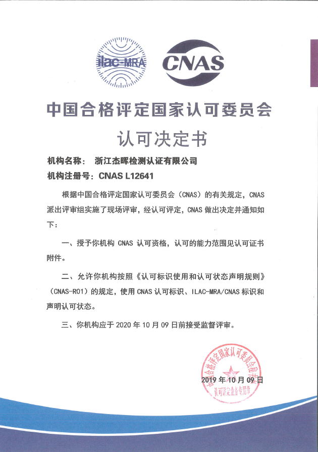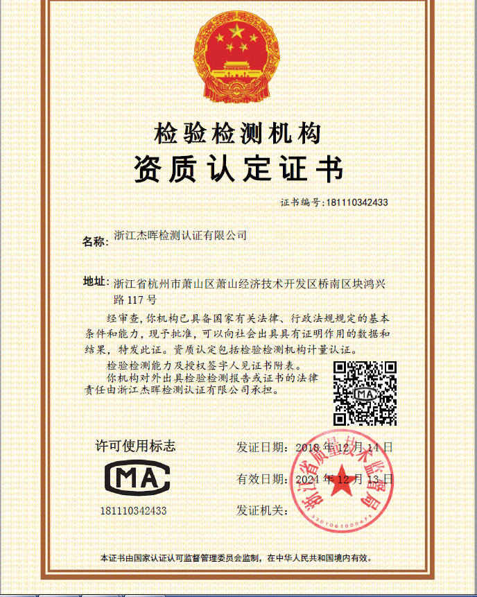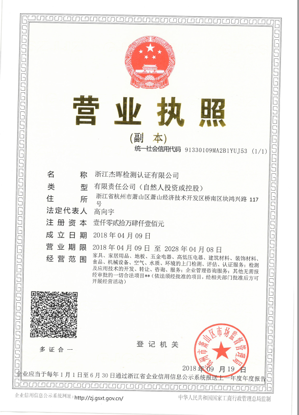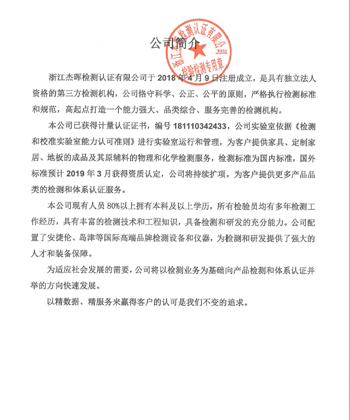 浙江杰晖检测认证有限公司于2018年4月9日注册成立,是具有独立法人资格的第三方检测机构,公司恪守科学、公正、公平的原则,严格执行检测标准和规范,高起点打造一个能力强大、品类综合、服务完善的检测机构。本公司已获得计量认证证书,编号181110342433,公司实验室依据《检测和校准实验室能力认可准则》进行实验室运行和管理,为客户提供家具、定制家居、地板的成品及其原辅料的物理和化学检测服务,检测标准为国内标准,国外标准预计2019年3月获得资质认定,公司将持续扩项,为客户提供更多产品品类的检测和体系认证服务。本公司现有人员80%以上拥有本科及以上学历,所有检验员均有多年检测工作经历,具有丰富的检测技术和工程知识,具备检测和研发的充分能力。公司配置了安捷伦、岛津等国际高端品牌检测设备和仪器,为检测和研发提供了强大的人才和装备保障。